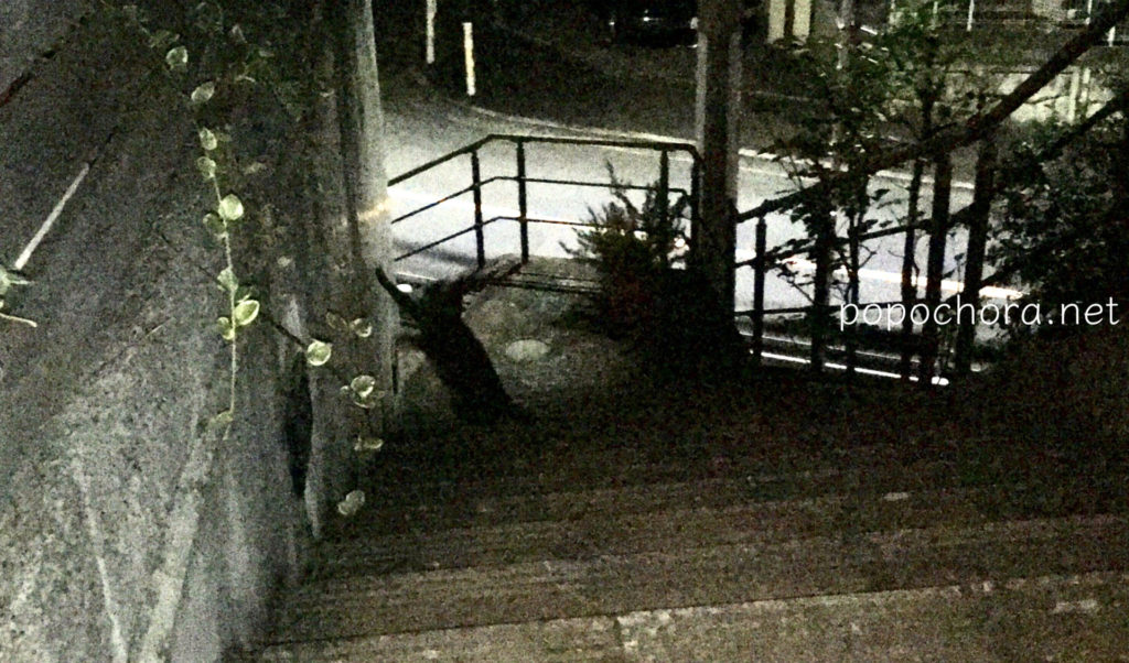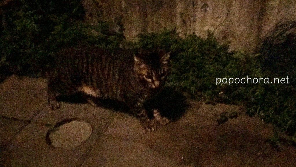 玄関を出るとちょらがいて、また大きな声でにゃあにゃあ言いました。寄ってこようとするのですが、また逃げるので、さっきのフードを持っていったのですが、私が少しでも手を動かそうとするとまた逃げてしまいます。