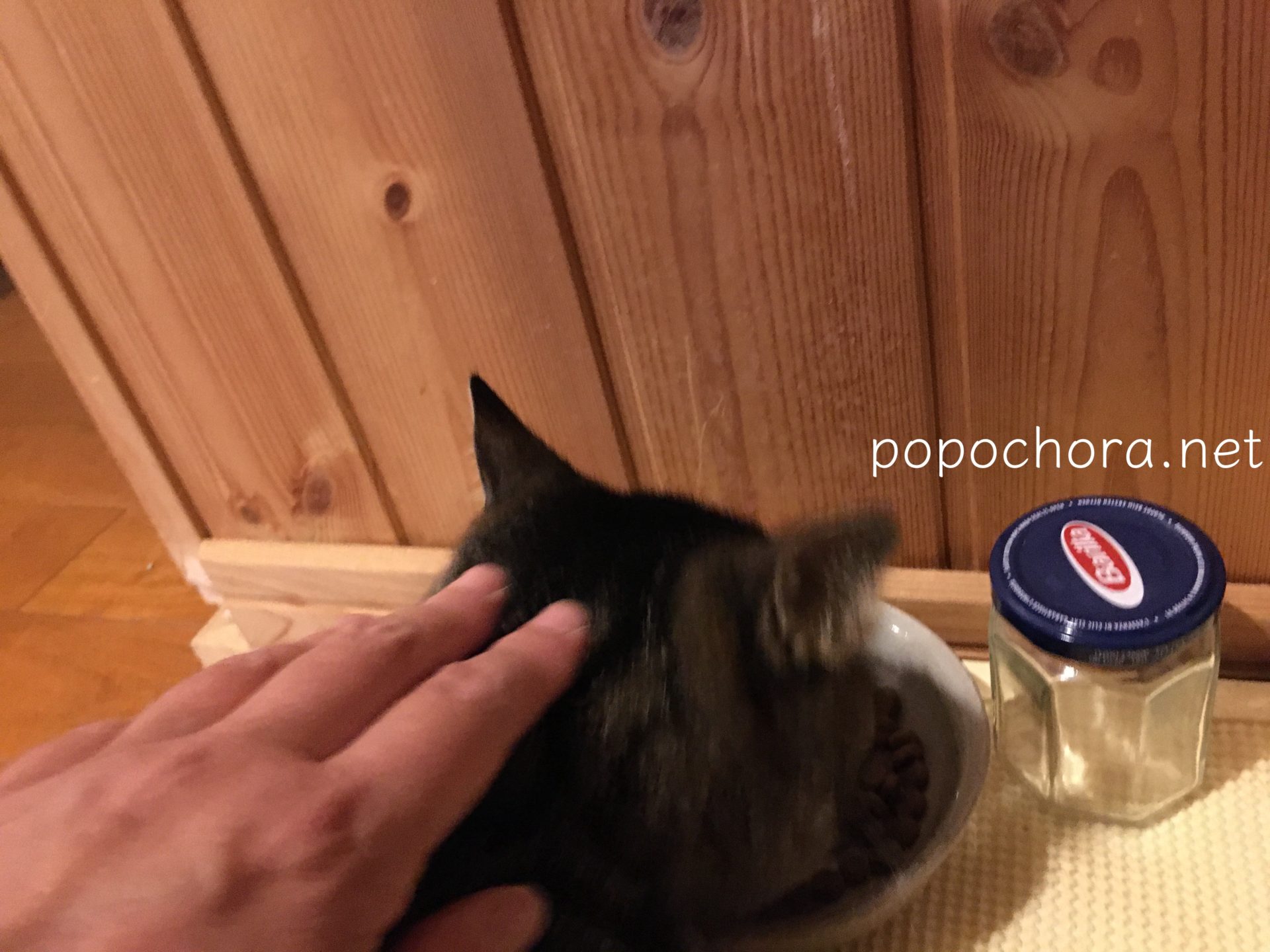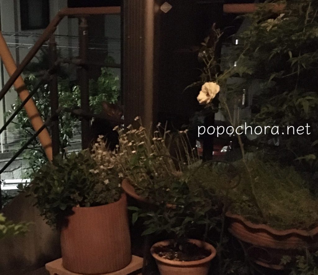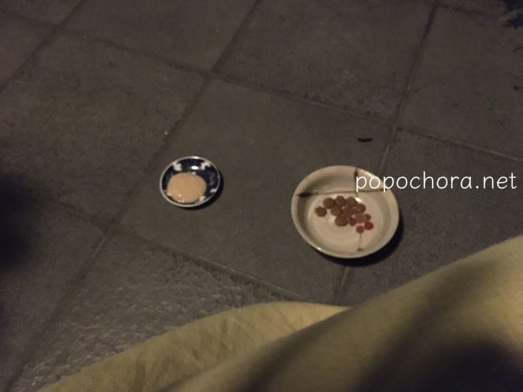 お腹空いているのは分かるけど玄関に置き餌するのはやめて、今夜も網戸を開けたままテラスの窓際ギリギリのところに置き餌しました。