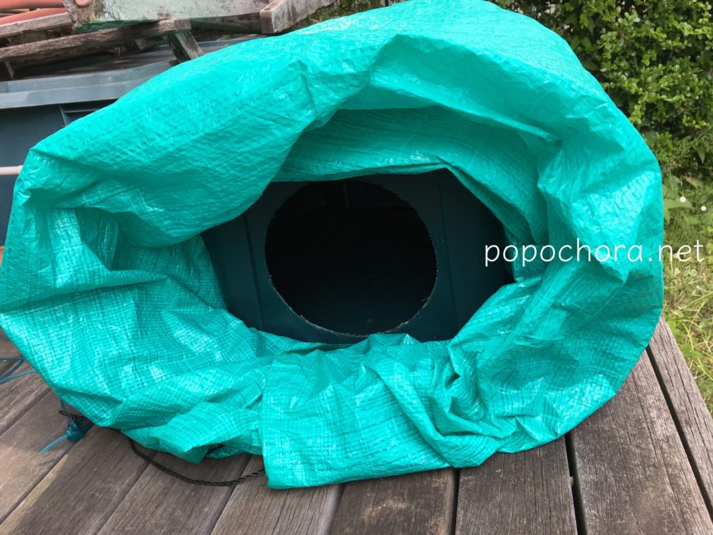 収集袋が見えないようにすっぽりとシートで包んでみたものの効果はなしでした。慣れさせるためにハウスの入り口の外にもフードを置いてみましたが、それでもダメでした。
