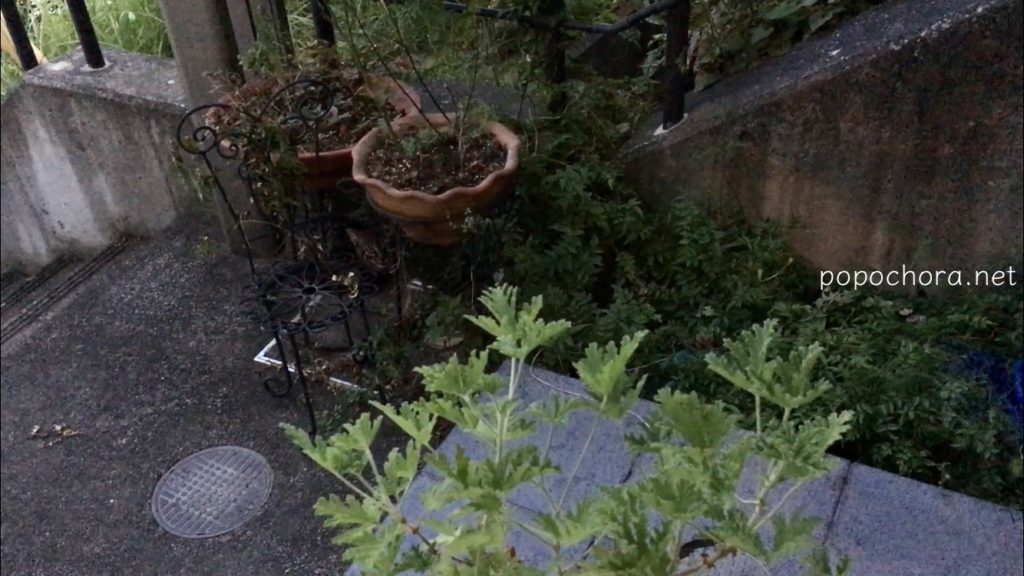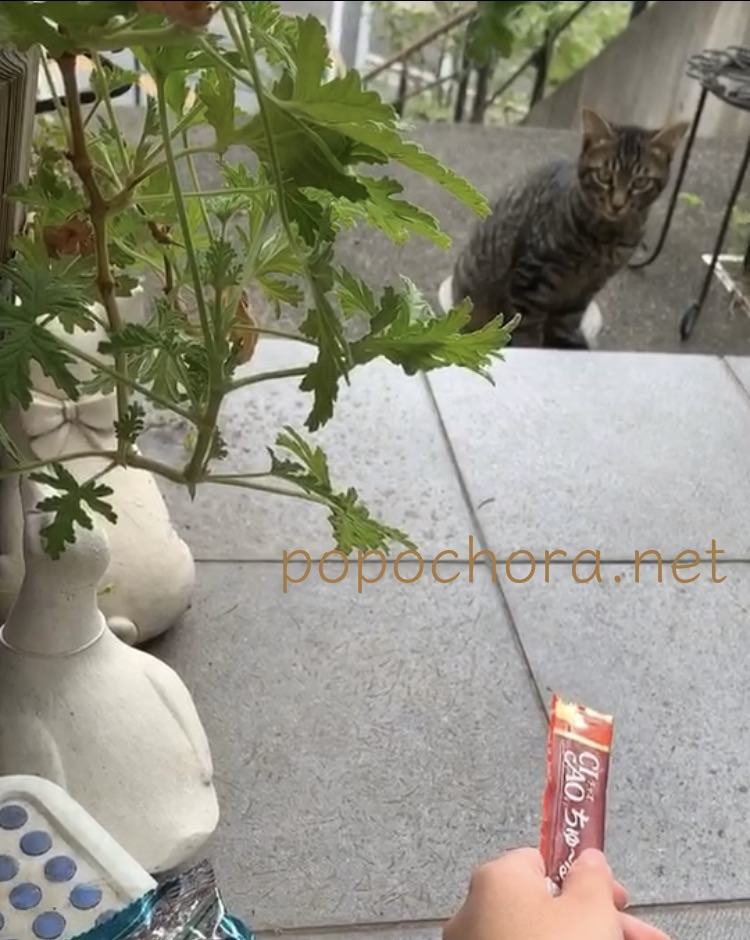 こちらは8月30日の様子。この植木鉢の下から、甘えた高い声で、ニャオニャオ言ってフードをねだります。