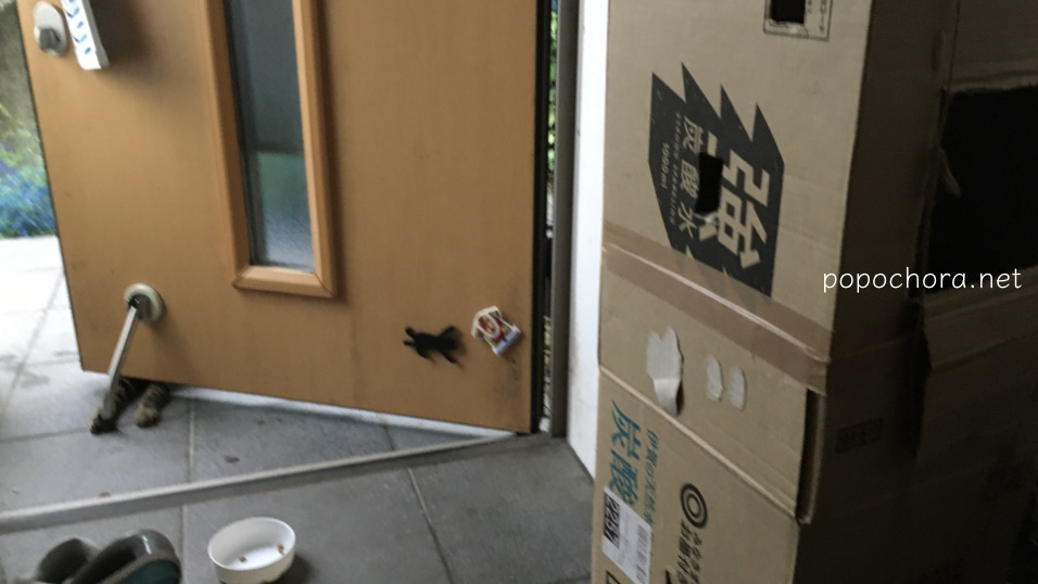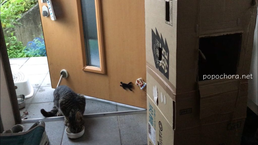 こちらは9月12日の様子。ドアを開けたままにしても、すぐ外でフードを食べるようになりました。