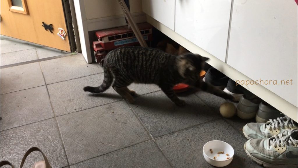 毎朝外のゴミ箱の上で私を待っているとらお。9月27日も朝から我が家の玄関の中に入ってきてフードを食べ、ボールで遊んでいました。